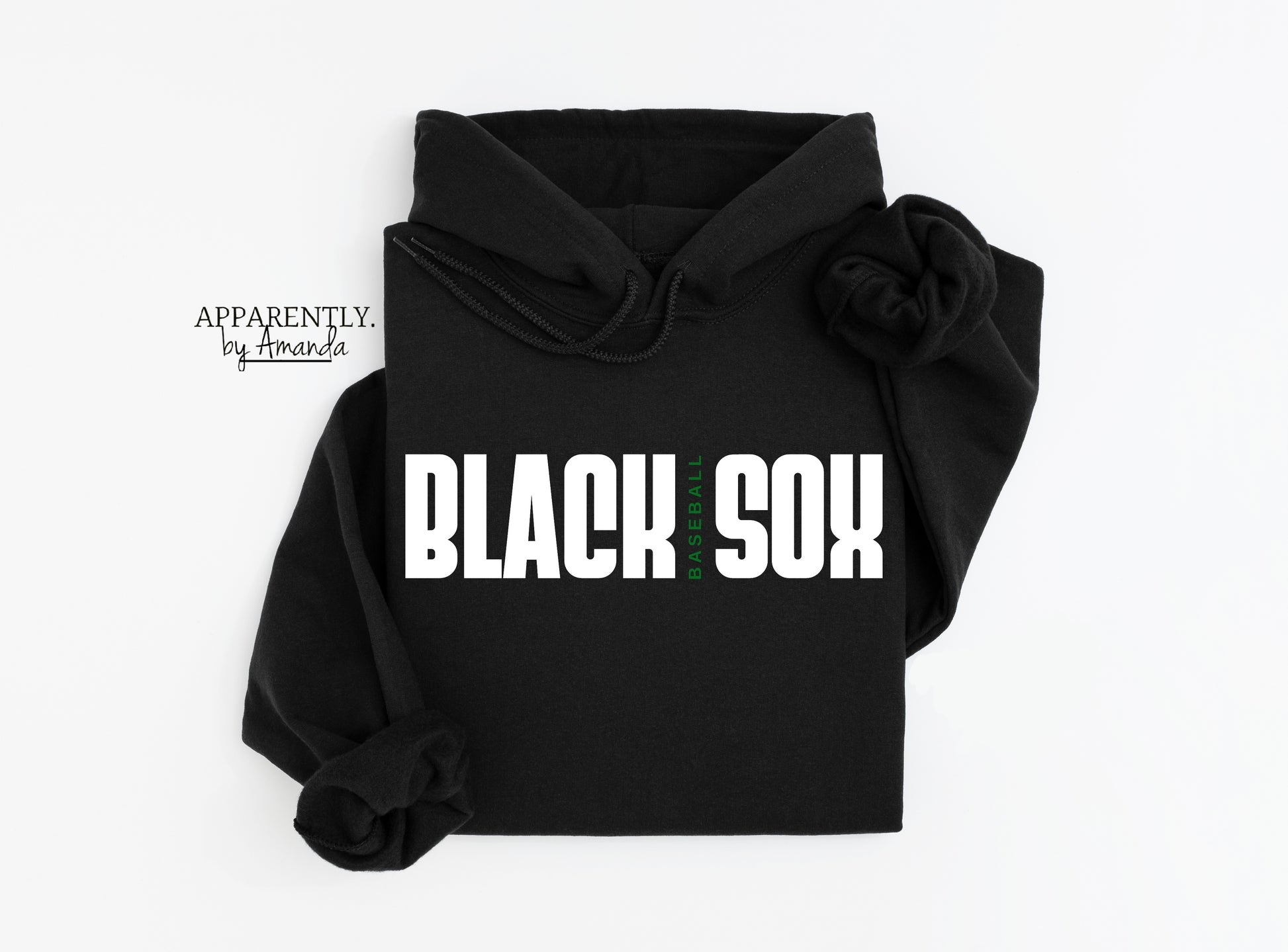 The BLACK SOX BASEBALL Hoodie features a sleek black design accented with white and green elements. Constructed for durability and comfort, this hoodie is suitable for athletes and fans alike, providing warmth during practices and events. Its color scheme allows for easy pairing with various outfits while demonstrating team spirit.